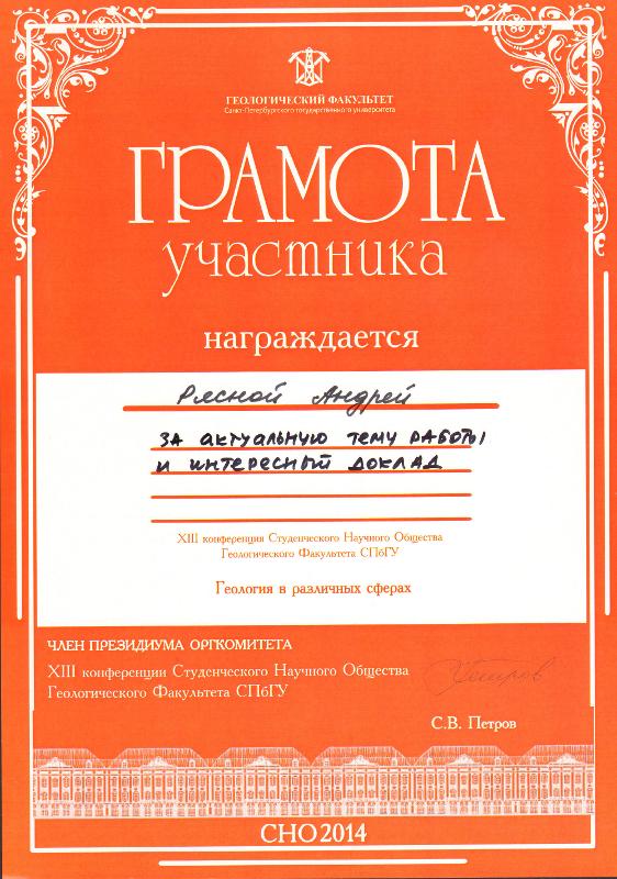 12–13 апреля в Санкт-Петербургском государственном университете состоялась XIII Всероссийская конференция студенческого научного общества «Геология в различных сферах», в которой принял участие студент 3 курса геологического факультета Воронежского государственного университета, кафедры исторической геологии и палеонтологии Андрей Рясной.