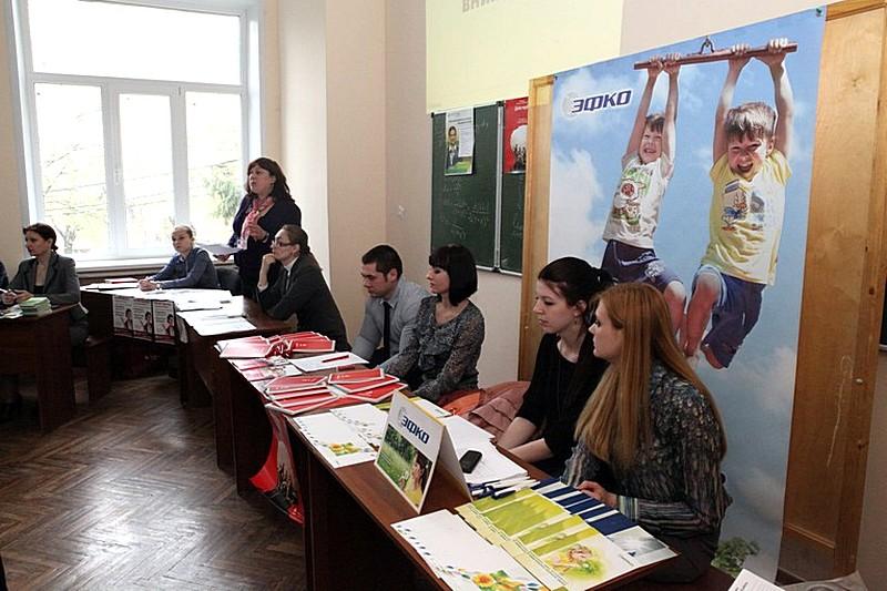 От работодателей первой выступила ведущий менеджер по персоналу ЗАО УК «ЭФКО» Татьяна Стрельченко. Она представила продукты, выпускаемые предприятиями «ЭФКО», рассказала о перспективах компании, о молодом дружном коллективе ее организации и пригласила выпускников на работу.