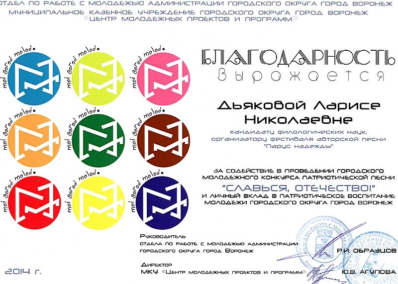 Ведущий специалист отдела довузовского образования ВГУ Л.Н. Дьякова получила благодарность от имени руководителя отдела по работе с молодежью администрации городского округа город Воронеж Р.И. Образцова и директора МКУ «Центр молодежных проектов и программ» Ю.В. Агуповой за содействие в проведении городского молодежного конкурса патриотической песни «Славься, Отечество!» и личный вклад в патриотическое воспитание молодежи Воронежа.