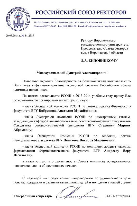 Российский Союз ректоров выразил благодарность ВГУ в лице ректора Воронежского государственного университета, профессора Дмитрия Ендовицкого за большой вклад университета в функционирование экспертной системы Российского совета олимпиад школьников.