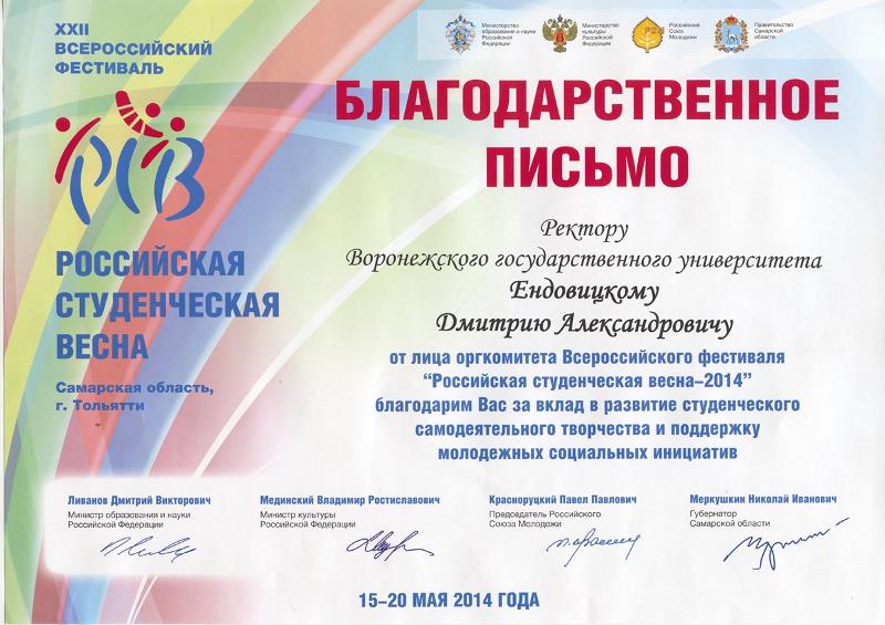 Оргкомитет Всероссийского фестиваля «Российская студенческая весна – 2014» объявил благодарность ректору ВГУ Дмитрию Ендовицкому за вклад в развитие студенческого самодеятельного творчества и поддержку молодежных социальных инициатив.