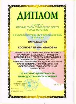 Зав. кафедрой экологической геологии геологического факультета Воронежского государственного университета, доктор геолого-минералогических наук, профессор Ирина Косинова стала лауреатом премии главы городского округа города Воронеж в области охраны окружающей среды. Вручение диплома лауреата и премии состоялось 11 июня.