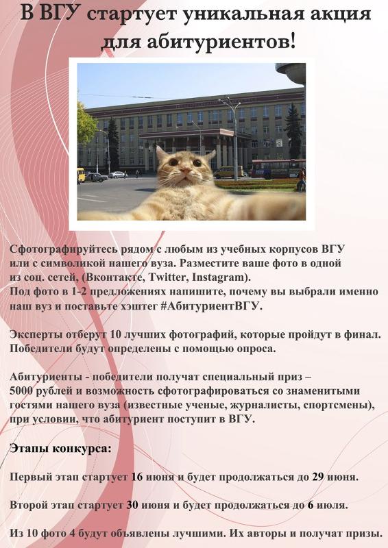Абитуриенты – победители получат специальный приз – 5000 рублей и возможность сфотографироваться со знаменитыми гостями нашего вуза (известные ученые, журналисты, спортсмены), при условии, что абитуриент поступит в ВГУ.
