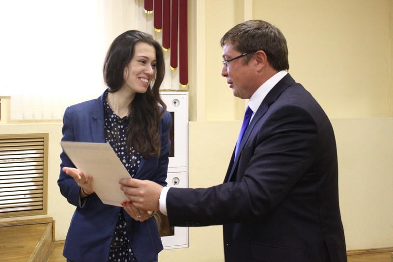 Открывая заседание, Дмитрий Александрович вручил выпускнице гимназии № 2, будущей студентке юридического факультета ВГУ Татьяне Цурган диплом за талант и дерзновения, проявленные на пути к знаниям и освоению своей будущей профессии.