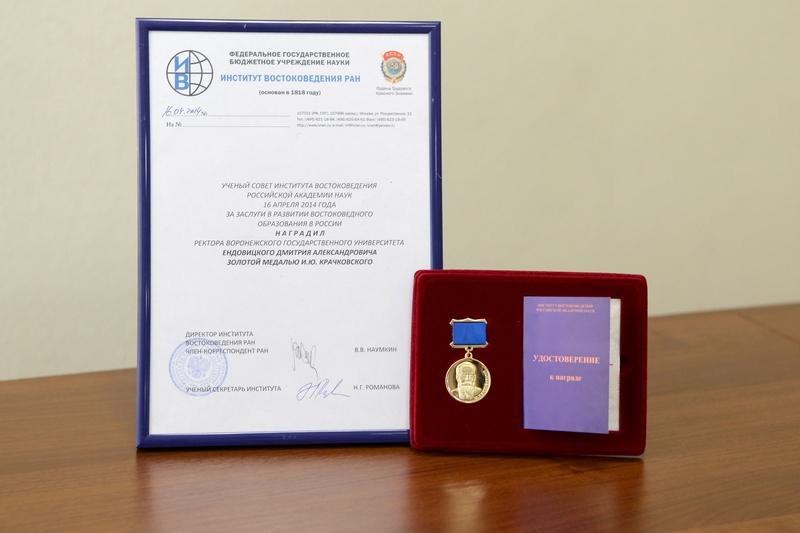 В завершение своей речи директор Института востоковедения РАН вручил ректору ВГУ престижную общественную награду – золотую медаль И.Ю. Крачковского, которой Учёный совет Института востоковедения Российской академии наук 16 апреля 2014 года наградил Дмитрия Александровича за заслуги в развитии востоковедного образования в России.
