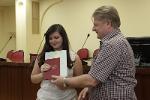 – Красный цвет ваших дипломов свидетельствует о том труде, который вы вложили в своё образование на протяжении трёх лет. Поздравляю вас и надеюсь, что вы сможете правильно применить все те знания, которые получили.