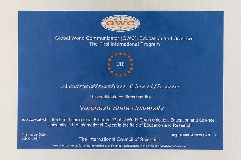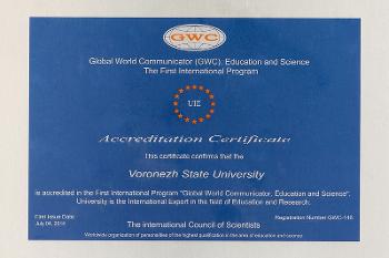 Воронежский государственный университет получил аккредитацию в первой международной программе «Глобальный мировой коммуникатор. Образование и наука». Сертификат был выдан Международным Советом Ученых – мировой организацией, деятельность которой направлена на повышение квалификации в области образования и науки. После получения аккредитации ВГУ признается международным экспертом в области образования и исследовательской деятельности.