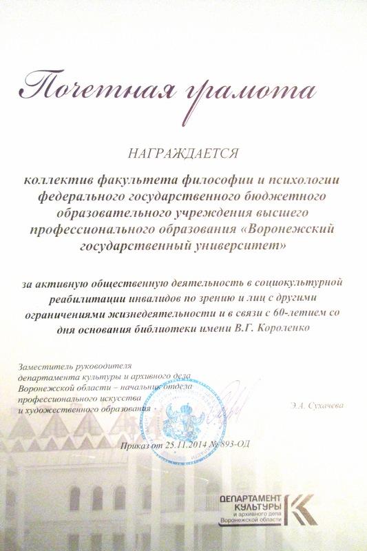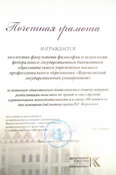 За активную общественную деятельность в социокультурной реабилитации инвалидов по зрению и лиц с другими ограничениями жизнедеятельности коллектив факультета философии и психологии ВГУ был награждён почётной грамотой Департамента культуры и архивного дела Воронежской области.