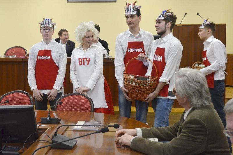 В завершение заседания собравшихся с наступающим праздником поздравили студенты университета, переодетые в символ нового года – молодых овечек.