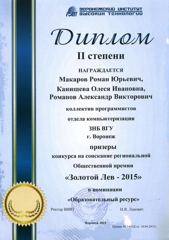 10 апреля на базе Воронежского института высоких технологий прошел очный этап и официальная церемония награждения победителей и призеров конкурса на соискание региональной Общественной премии «Золотой лев – 2015». На конкурс было заявлено более 200 работ учащихся, студентов и сотрудников муниципальных образовательных организаций и учреждений профессионального образования Воронежа, Воронежской области и иных регионов.