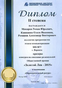 В номинации «Образовательный ресурс» приняли участие педагоги вузов и муниципальных учреждений города и области. Сотрудники отдела компьютеризации ЗНБ ВГУ представили на конкурс проект: Облачный сервис «АБАД» – автоматизации библиотечного и архивного дела. Работа была удостоена диплома 2-й степени.