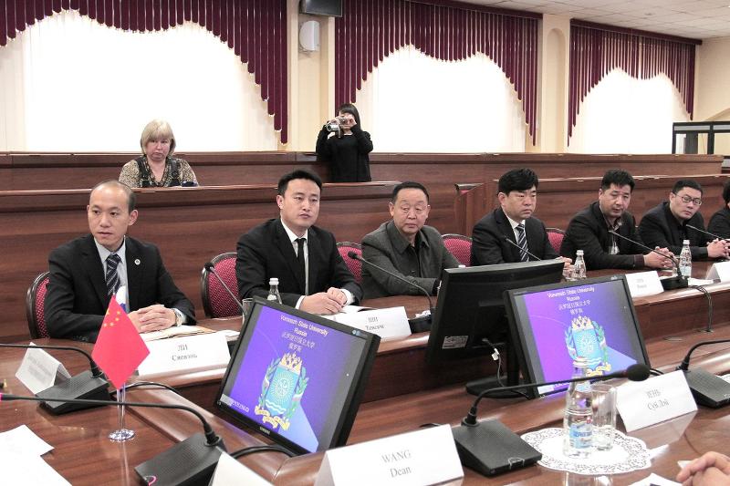 Ректор ВГУ Дмитрий Ендовицкий выступил перед китайской делегацией с презентацией об истории Воронежа и университета, о структуре вуза, о тех позициях, которые ВГУ занимает в международных рейтингах, о факультетах и работе, осуществляемой профессорско-преподавательским составом.