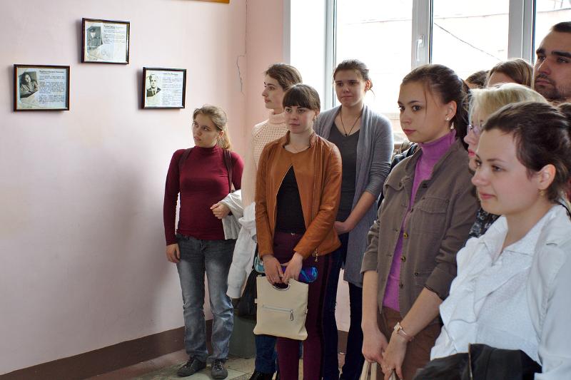 В своём приветственном слове декан исторического факультета, профессор Владимир Глазьев призвал слушателей (в основном — студентов 1 курса факультета) быть достойными своих предшественников и не предавать забвению память о Великой Отечественной войне. А заведующий кафедрой истории России, профессор Михаил Карпачёв рассказал понемногу о каждом из тех, чьи биографии представлены на выставке. Многих из них он, как представитель старшего поколения преподавателей факультета, знал лично. «Хорошие были люди, и хорошо работали во славу факультета и университета», - так подытожил Михаил Дмитриевич своё выступление.