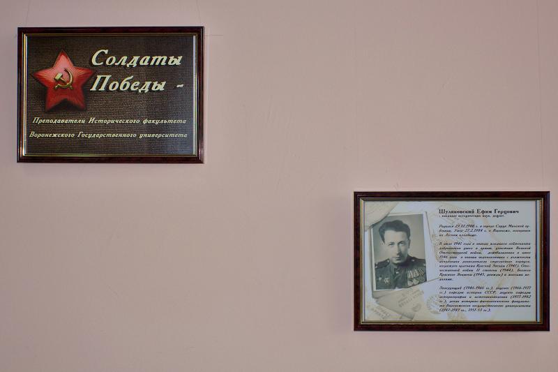 5 мая на историческом факультете ВГУ состоялось открытие выставки «Солдаты Победы», приуроченной к празднованию 70-летия Победы в Великой Отечественной войне. На ней представлены фотографии и краткие биографические очерки участников войны, в разное время преподававших на историческом факультете нашего университета. Среди них — Ефим Шуляковский, Анатолий Москаленко, Александр Немировский, Виктор Афонюшкин, Григорий Птушкин и многие другие.