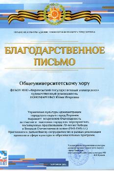 За участие в массовых городских мероприятиях, посвященных празднованию 70-летия Победы в Великой Отечественной войне, общеуниверситетский хор ВГУ получил благодарственное письмо от Управления культуры администрации городского округа город Воронеж и приглашение к дальнейшему сотрудничеству в реализации проектов в сфере культуры и образовательных программ. Девятого мая этого года состоялся успешный дебют хора – на площади Ленина состоялось грандиозное хоровое шоу, в котором приняли участие 1200 человек, среди которых были университетские хористы. Также хор выступал на собственной творческой площадке Воронежского госуниверситета.