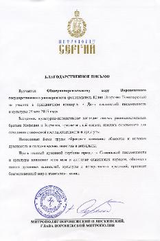 Кроме того, за участие в праздничном концерте в День славянской письменности и культуры 24 мая общеуниверситетскому хору ВГУ от имени Митрополита Воронежского и Лискинского Сергия было вручено благодарственное письмо и памятный подарок – икона Явление Пресвятой Богородицы преподобному Сергию Радонежскому. Молодой хор ВГУ принимал участие в праздновании наравне с ведущими хоровыми коллективами города Воронежа: хор Оперного театра, Академии искусств, музыкального училища имени Ростроповичей, ВГПУ, Воронежского музыкально-педагогического колледжа, Академический симфонический оркестр Филармонии под управлением Игоря Вербицкого.