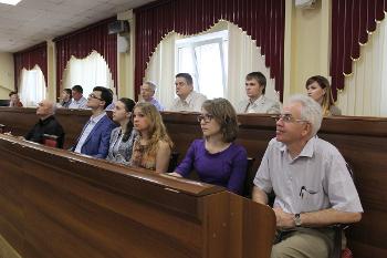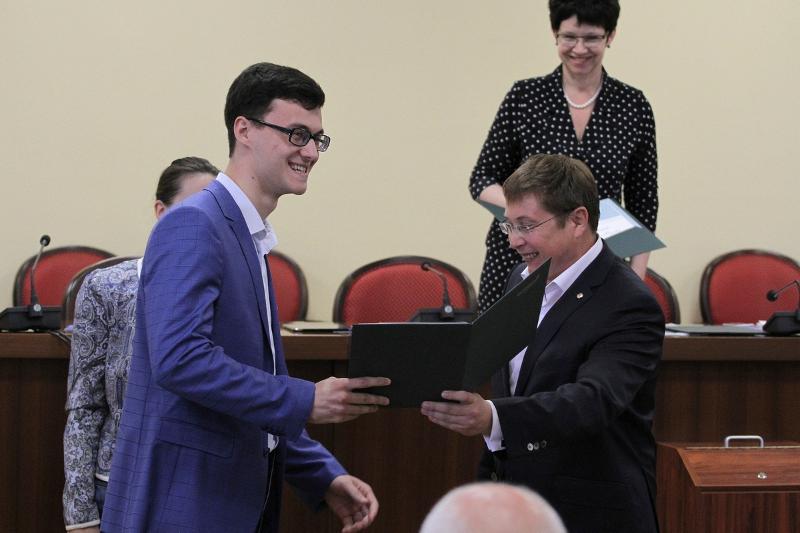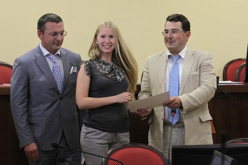 Перед началом заседания Дмитрий Ендовицкий поздравил студентов ВГУ – лауреатов стипендиальной программы Владимира Потанина и победителей первого ежегодного профессионального конкурса среди студентов юридических факультетов высших учебных заведений и юридических техникумов «Гестор».