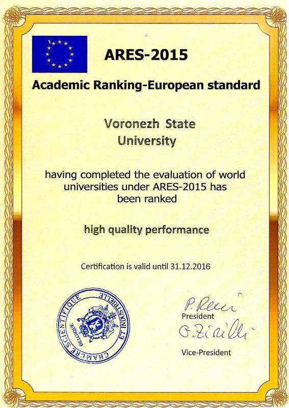Кроме того, ВГУ вошел в рейтинг Academic Ranking of World Universities-European Standard ARES-2015, опубликованный Европейской научно-промышленной палатой, по категории А+.