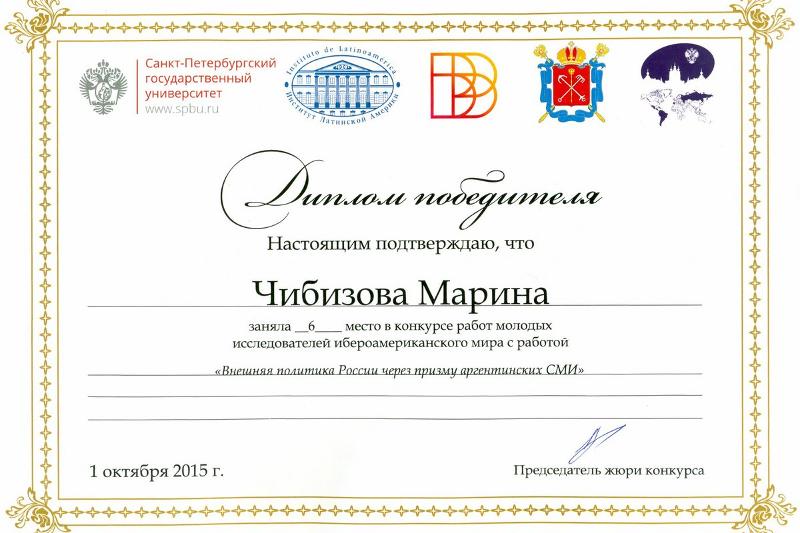 – Данная работа привлекла внимание членов отборочной группы, так как она посвящена отношениям России с ее стратегическим партнером в Латинской Америке – Аргентиной. В условиях нарастания напряженности между Россией и странами «Большой семерки» тема сотрудничества России с Аргентиной и со всей Латинской Америкой в целом приобретает еще большую актуальность. Таким образом, в современных условиях развитие крепких торгово-промышленных, военно-политических, гуманитарных и туристических связей является одним из основных направлений внешней политики для обеих стран. Форум оказался для нас очень познавательным, поскольку предоставил возможность послушать выступления видных политических и общественных деятелей Латинской Америки, ведущих отечественных и зарубежных специалистов. Участие в форуме стало прекрасной возможностью получить уникальную информацию из первых рук, которая поможет нам в дальнейших научных исследованиях, – комментирует Марина Чибизова.