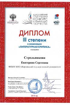 На награждение победителей Всероссийского студенческого конкурса литературного творчества съехались студенты со всей России: из Московской, Ленинградской, Тамбовской, Оренбургской, Воронежской областей, а также республики Татарстан. Представительница Воронежского государственного университета, студентка третьего курса филологического факультета Екатерина Стрельникова победила в номинации «Литературная критика».