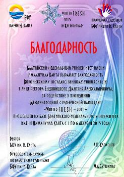 Студентка факультета компьютерных наук Воронежского государственного университета Екатерина Акимова, аспирантка факультета прикладной математики, информатики и механики ВГУ Ирина Тришина и студент факультета ПММ ВГУ Никита Титаренко стали участниками Международной студенческой площадки «Winter F.R.E.S.H.-2015», прошедшей с 1 по 6 декабря в Калининграде на базе Балтийского федерального университета имени Иммануила Канта.