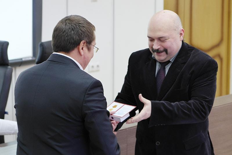 Открылось заседание торжественным вручением дипломов доктора химических наук представителям химического факультета ВГУ Александру Зяблову и Андрею Потапову. Медалями «За заслуги в подготовке защитников отечества» были награждены декан факультета компьютерных наук Эдуард Алгазинов, декан математического факультета Александр Баев, декан геологического факультета Виктор Ненахов, декан факультета прикладной математики, информатики и механики Александр Шашкин, декан экономического факультета Павел Канапухин.