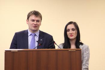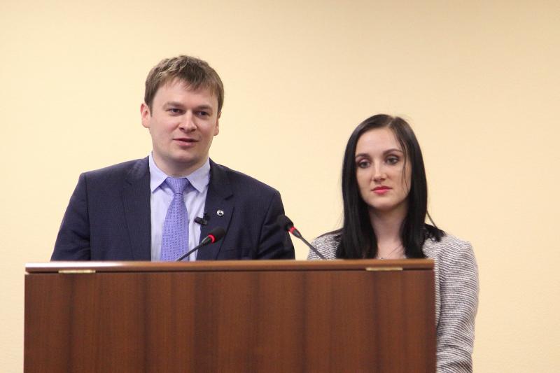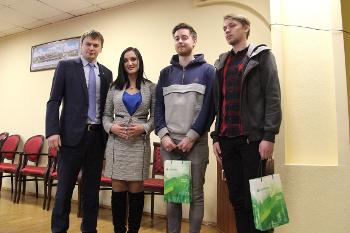 Перед началом заседания заместитель председателя Центрально-Черноземного банка ПАО Сбербанк Денис Баленко и помощник председателя ЦЧБ Юлия Сорокина наградили за активную гражданскую позицию студентов факультета международных отношений ВГУ Артема Коломийца и Сергея Оборотова.