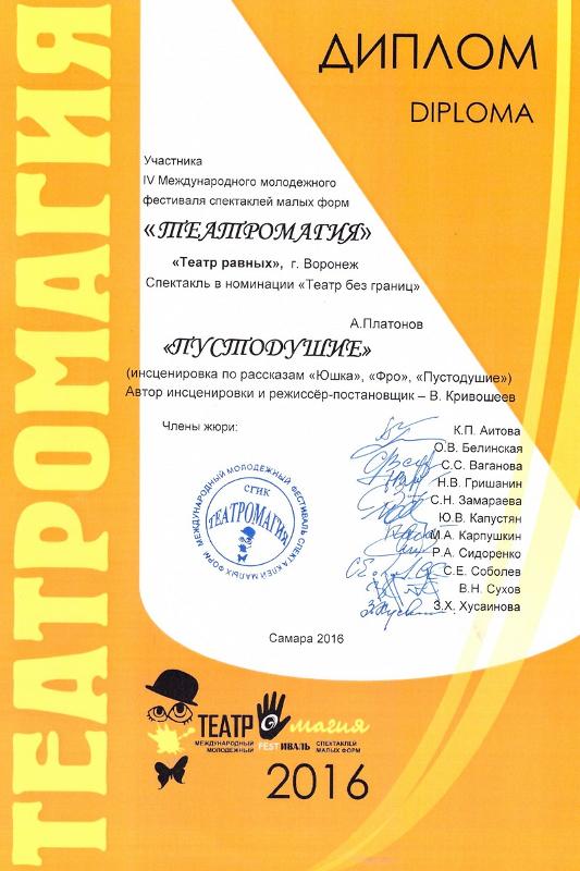 С 12 по 15 мая воронежский «Театр равных» принял участие в международном фестивале театров малых форм «Театромагия», проходившем в городе Самара. Фестиваль собрал около тридцати профессиональных и любительских театров из России и ближнего зарубежья. В программе мероприятия, ставшего престижным и популярным среди российских театров, были не только спектакли, прошедшие строгий конкурсный отбор, но и обсуждения, круглые столы и мастер-классы.