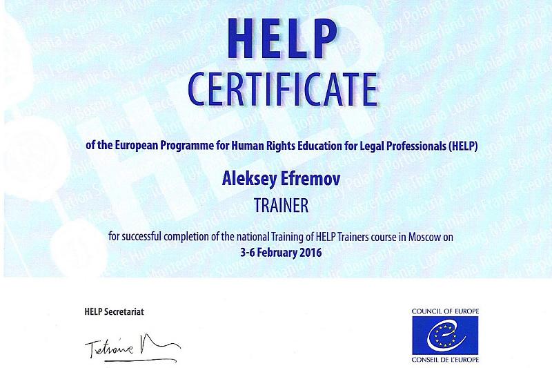 В феврале этого года для группы тренеров, в которую по итогам конкурсного отбора вошел Алексей Ефремов, Программным офисом Совета Европы был организован очный тренинг. В ходе тренинга участники освоили интерактивные и групповые методики обучения, возможности платформы дистанционного образования Программы HELP, а также разработали в малых группах и провели собственные мини-курсы на основе методологии HELP. Следующим этапом стала разработка тренерами собственных курсов на платформе дистанционного образования Программы HELP по тематике Программы.