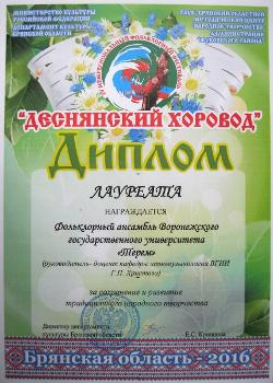 Фольклорный ансамбль Воронежского государственного университета «Терем» (руководитель – Галина Христова) принял участие в IV Межрегиональном фольклорном фестивале «Деснянский хоровод», проходившем в Брянской области и городе Брянск 10–12 июня. В фестивале приняли участие 19 фольклорных коллективов из разных регионов России, каждый из которых представлял песенные традиции своего региона. Заключительный гала-концерт проходил в День России на главной городской площадке Брянска.