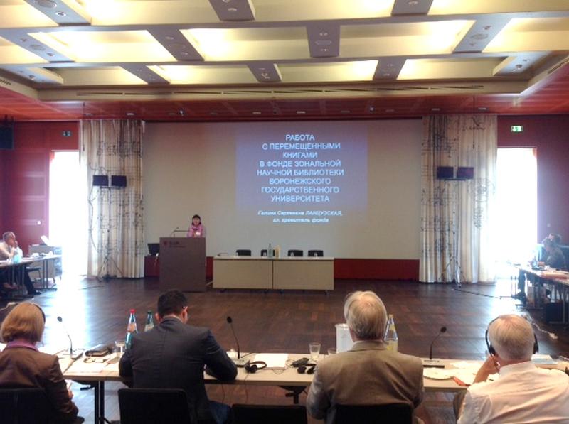 На заседании 23 мая Галина Сергеевна представила доклад «Работа с перемещенными книгами в ЗНБ ВГУ». Выступление было посвящено двум направлениям научной работы ЗНБ по изучению истории фонда: потерям ЗНБ в годы войны и работе с перемещенными в результате Второй мировой войны книгами в составе университетской библиотеки. С 2002 года сотрудники ЗНБ принимают участие в составлении «Сводного каталога культурных ценностей, похищенных и утраченных в период Второй мировой войны», издание которого осуществляет Министерство культуры РФ и Российская Национальная библиотека. Несколько книг одиннадцатого тома полностью посвящены библиотеке Воронежского университета. Пострадавший во время войны университетский книжный фонд восстанавливался за счет дублетных экземпляров, полученных из крупнейших книгохранилищ страны. Среди прибывших в Воронеж книг находились также фонды, перемещенные из Германии. В 2008 году, благодаря наличию систематизированной информации, университетская библиотека включилась в работу в рамках федеральной целевой программы «Культура России» по инвентаризации, определению бывшей государственной принадлежности и составлению электронной базы данных перемещенных книжных ценностей.