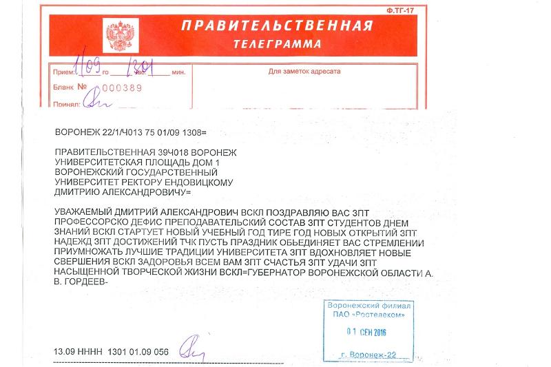 Губернатор Воронежской области Алексей Гордеев поздравил коллектив Воронежского государственного университета с Днем знаний. «Стартует новый учебный год – год новых открытий, достижений, надежд. Пусть праздник объединяет вас в стремлении приумножать лучшие традиции университета, вдохновляет на новые свершения», – отмечает в своем поздравлении Алексей Васильевич.