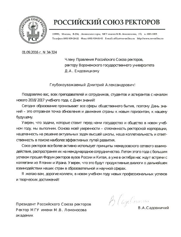 Президент Российского союза ректоров, ректор МГУ им. М.В. Ломоносова Виктор Садовничий поздравил сотрудников, студентов и аспирантов Воронежского государственного университета с Днем знаний и началом нового учебного года.