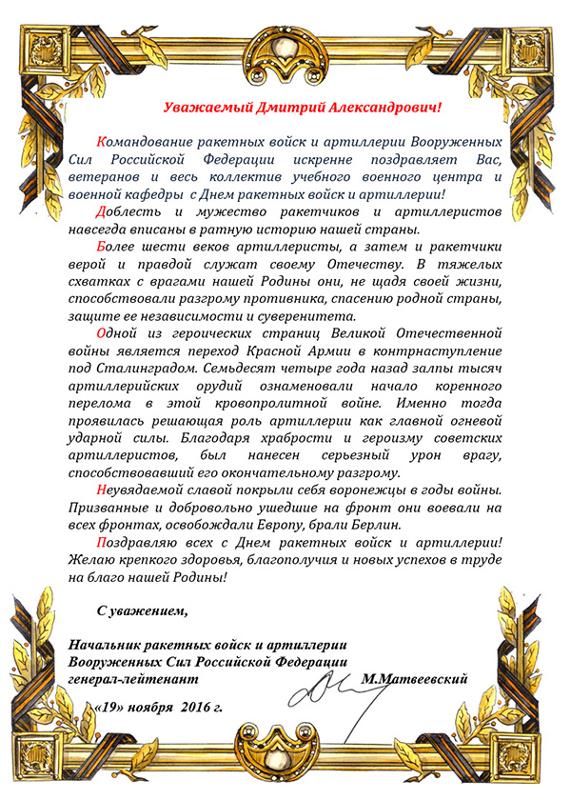 19 ноября коллектив Учебного военного центра и военной кафедры Воронежского государственного университета с Днём ракетных войск и артиллерии поздравил начальник ракетных войск и артиллерии Вооружённых Сил РФ генерал-лейтенант Михаил Матвеевский.