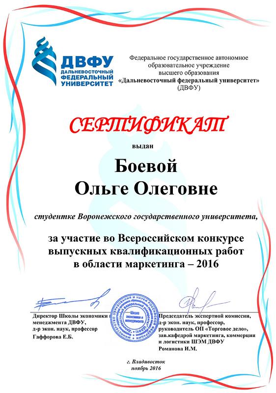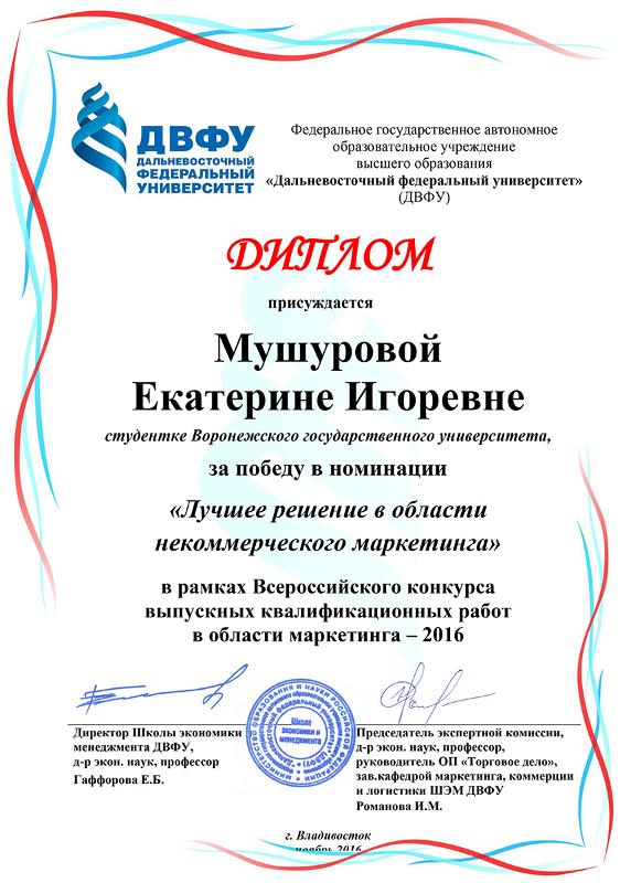 Представители кафедры маркетинга экономического факультета Воронежского государственного университета приняли участие в конкурсах на лучшую выпускную квалификационную работу в области маркетинга. Организаторами выступили Дальневосточный федеральный университет (Владивосток) и Государственный университет управления (г. Москва).