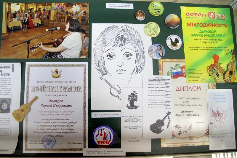 На выставке представлены экспонаты из личной коллекции Ларисы Дьяковой – автора-исполнителя, журналиста, преподавателя кафедры телевизионной и радиожурналистики ВГУ, автора и ведущей радиопрограммы «Территория слова». Представлены фотографии разных лет, сборники стихов российских бардов, книги о них, научные работы о феномене авторской песни в нашей стране. Подробный рассказ о фестивалях прошлых лет органично дополняет коллекция сувенирных гитар, песни бардов на различных носителях – от виниловых пластинок до компакт-дисков и приглашение на «Парус надежды-2016», который состоится 17-19 июня.