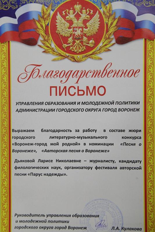 Ведущий специалист Отдела довузовского образования Управления по довузовской работе и набору студентов Воронежского государственного университета, преподаватель факультета журналистики Лариса Дьякова отмечена Благодарственным письмом управления образования и молодежной политики городского округа город Воронеж Любови Кулаковой.
