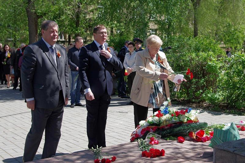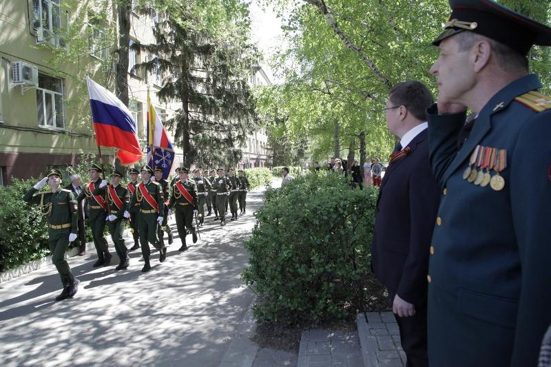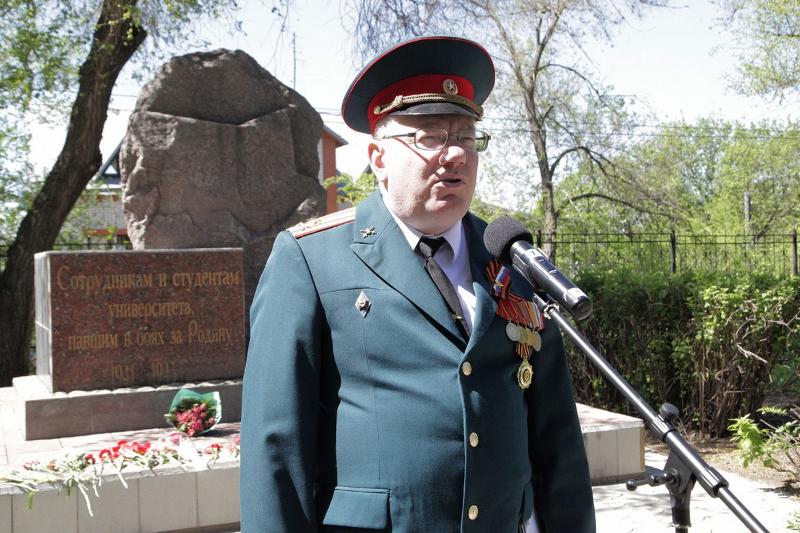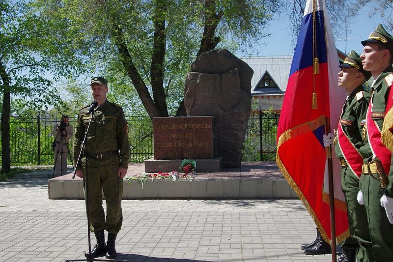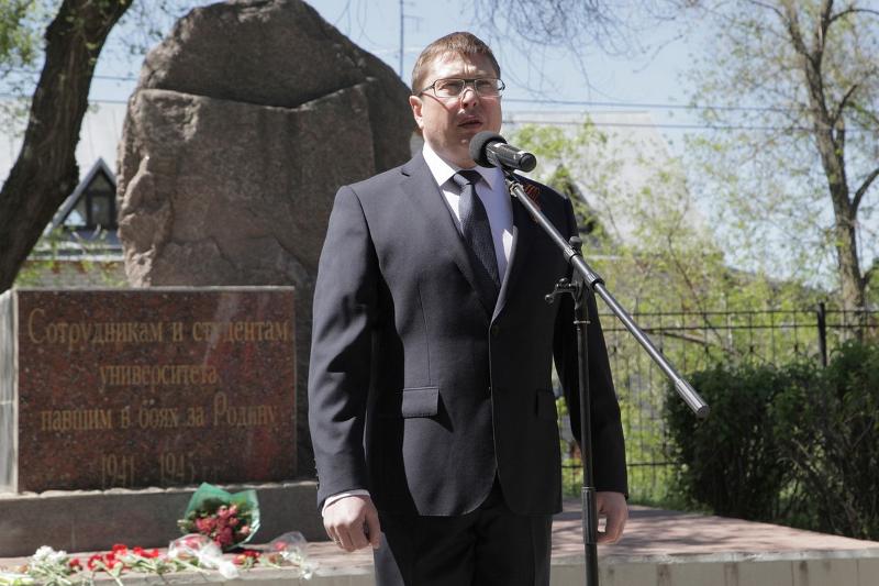 К памятнику сотрудникам и студентам, погибшим во время Великой Отечественной войны, вышел взвод почетного караула и знаменная группа курсантов Учебно-военного центра Воронежского госуниверситета. После чего, приветствуя собравшихся ветеранов, коллег и студентов, выступил ректор ВГУ Дмитрий Ендовицкий: