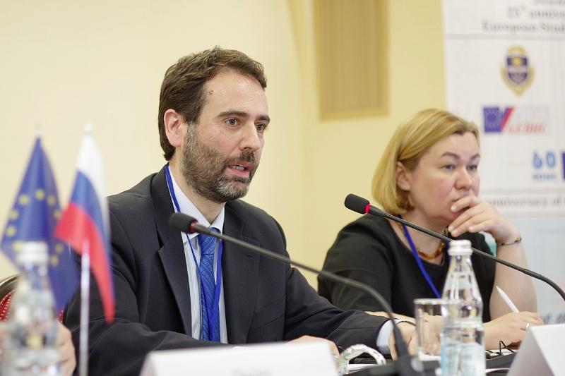 – ВГУ – образец тесного сотрудничества с университетами ЕС, он занимает одно из первых мест с точки зрения реализации инициатив Союза. 20 проектов Erasmus+, 4 проекта по сотрудничеству, направленных на совершенствование учебных планов, активные академические обмены – лучшее этому подтверждение, – произнес перед своим докладом Глава отдела экономики и торговли Представительства Европейского союза в Российской Федерации, господин Луис Портеро. В своем сообщении он рассказал о создании ЕС после Второй мировой войны, о текущем состоянии сообщества и его будущем, и отметил, что будущее объединения трудно представить без развития отношений с самым большим соседом – Россией. После этого он подчеркнул роль Евросоюза в жизни стран-членов, раскрыл проблемы в ЕС, такие как национальный эгоизм, ксенофобия, политические потрясения, терроризм и о сценариях развития отношений между странами в Евросоюзе.
