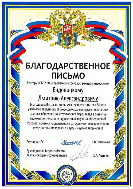 В мае 2017 года завершились отборочные этапы Федерального Студенческого Турнира Трёх Наук. Их результаты, а также планы по дальнейшему развитию проекта были представлены на III Всероссийском конкурсе студенческих научных объединений и конструкторских бюро, состоявшемся в Барнауле на базе Алтайского государственного университета с 1 по 5 июня. Конкурс проводился при поддержке Министерства образования и науки Российской Федерации, Правительства Алтайского края, Всероссийского клуба молодых исследователей, Российского союза студенческих организаций. Участниками Конкурса стали 82 молодых исследователя из 53 вузов 35 городов России. Турнир Трёх Наук был презентован Викторией Перевозниковой, студенткой математического факультета Воронежского государственного университета, членом Оргкомитета Турнира. Проект молодых ученых ВГУ получил высокую оценку со стороны экспертного корпуса, а в адрес руководства вуза было направлено благодарственное письмо.