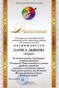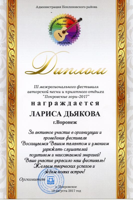 19 августа в городе Таганрог Ростовской области состоялся III Межрегиональный фестиваль авторской песни «Покровские зори». Ведущий специалист управления по довузовской работе и набору студентов Воронежского государственного университета, преподаватель журфака и ведущая программы «ГТРК-Воронеж» Лариса Дьякова стала почетным гостем фестиваля и приняла активное участие в его работе.