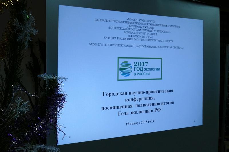 15 января на базе борисоглебской библиотеки имени В. Кина в рамках образовательного проекта БФ ВГУ «Открытый университет» прошла городская научно-практическая конференция, посвященная итогам Года экологии в России. Организатором мероприятия выступила кафедра биологии и физической культуры и спорта филиала университета. Участниками мероприятия стали представители администрации Борисоглебского городского округа, руководители предприятий, представители образовательных организаций, учреждений культуры.