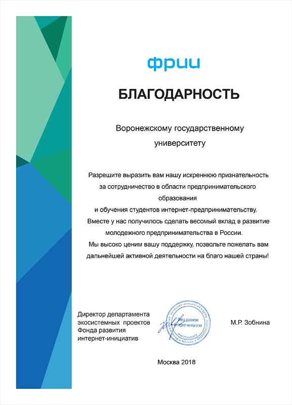 Директор департамента экосистемных проектов Фонда развития интернет-инициатив (ФРИИ) Маргарита Зобнина выразила благодарность ректору Воронежского государственного университета Дмитрию Ендовицкого за вклад в реализацию проектов по молодежному предпринимательству в 2017 году.