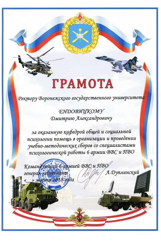 Командующий 6 армией ВВС и ПВО генерал-лейтенант авиации Александр Дуплинский выразил благодарность кафедре общей и социальной психологии ВГУ за активное участие в учебно-методическом сборе и оказанную профессиональную помощь.