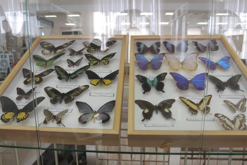Многие бабочки были собраны в различных зоогеографических областях заведующим кафедрой зоологии и паразитологии профессором Сергеем Гапоновым. Эта выставка предоставляет уникальную возможность увидеть мир крылатых красавиц в его многообразии. Среди экспонатов бабочки со всех континентов и географических областей – Юго-Восточной Азии, Северной и Южной Америки, Африки, России, Австралии. Это нимфалиды, парусники, павлиноглазки, самые крупные южноамериканские бабочки – совка Агриппина, Морфо, Калиго, размер крыльев которых достигает 16–18 см. Бабочка «Золото Бутана» является одним из символов этого королевства. Роскошные птицекрылки олицетворяют экзотику Австралии, Папуа и Океании.
