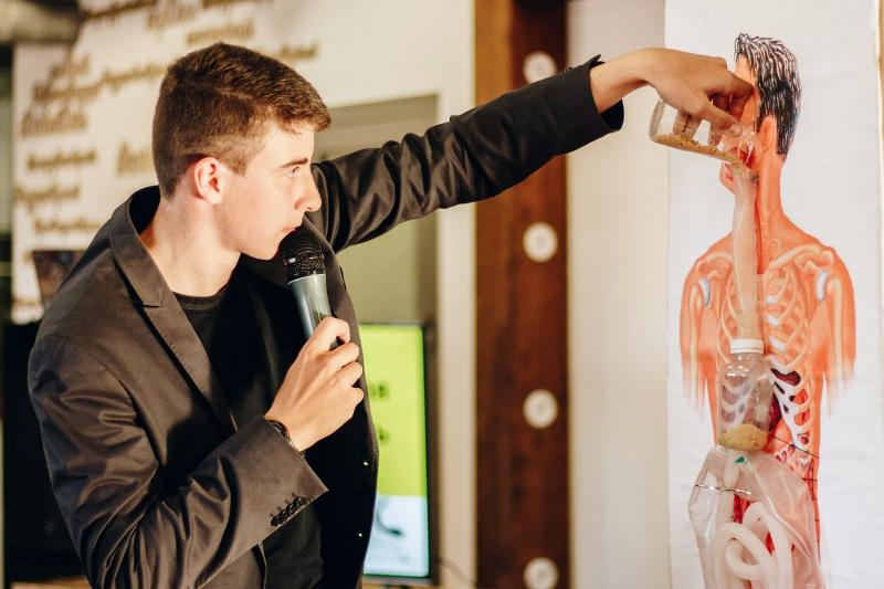 Внутренние процессы человека познал Дмитрий Свиридов – ученик 8 класса. В будущем он хочет стать хирургом. А пока в жанре Stand up Дмитрий рассказал о процессе пищеварения, превратив свое выступление в настоящее мини-представление. Он наглядно показал, какие органы участвуют в пищеварительном процессе и с какой скоростью.