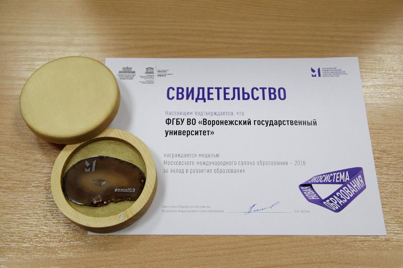 Работа команды нашего вуза на Салоне была высоко отмечена организаторами. ВГУ получил медаль за вклад в развитие образования. Организаторы продолжили традицию изготовления медалей из натуральных и экологичных материалов. Награду представителям Воронежского госуниверситета вручил помощник вице-премьера России по вопросам образования Вениамин Каганов.