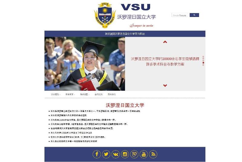 29 мая запущена китайская версия официального сайта Воронежского государственного университета. Посетителям сайта представлена подробная информация о вузе – контактные данные, история, стоимость обучения, информация о поступлении, программах академического обмена и сотрудничестве с зарубежными вузами.