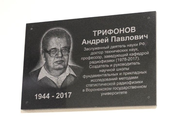 15 июня в здании Главного учебного корпуса Воронежского государственного университета состоялось торжественное открытие мемориальной доски, посвященной Заслуженному деятелю науки Российской Федерации, доктору технических наук, профессору, заведующему кафедрой радиофизики физического факультета ВГУ (1978–2017) Андрею Павловичу Трифонову. В мероприятии приняли участие представители университетского сообщества, ученики, друзья и близкие ученого.