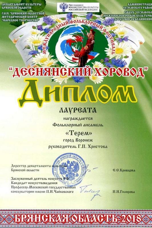 Фольклорный ансамбль Воронежского государственного университета «Терем» с успехом выступил на V Международном фольклорном фестивале «Деснянский хоровод», который прошел в Брянске и Брянской области при поддержке Министерства культуры Российской Федерации.